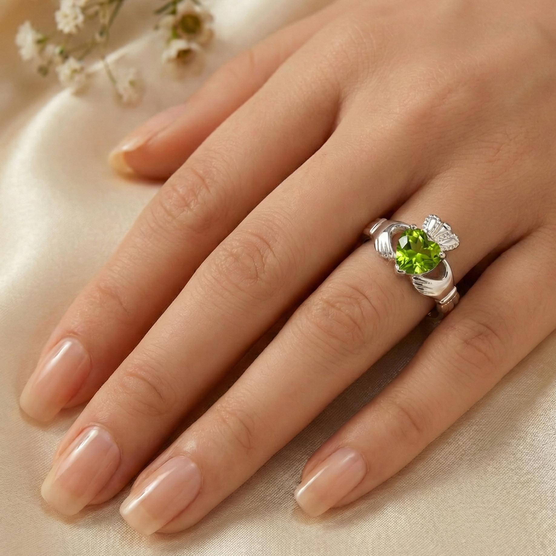 Measuring a captivating 12mm from the top of the crown to the bottom of the heart, this Claddagh ring makes a statement of timeless beauty. The band, 2.7mm wide, strikes the perfect balance between strength and comfort, ensuring a delightful fit for everyday wear. Nestled at its core is a remarkable 6mm heart-shaped green Peridot gemstone, radiating natural splendor and adding a touch of refined allure.