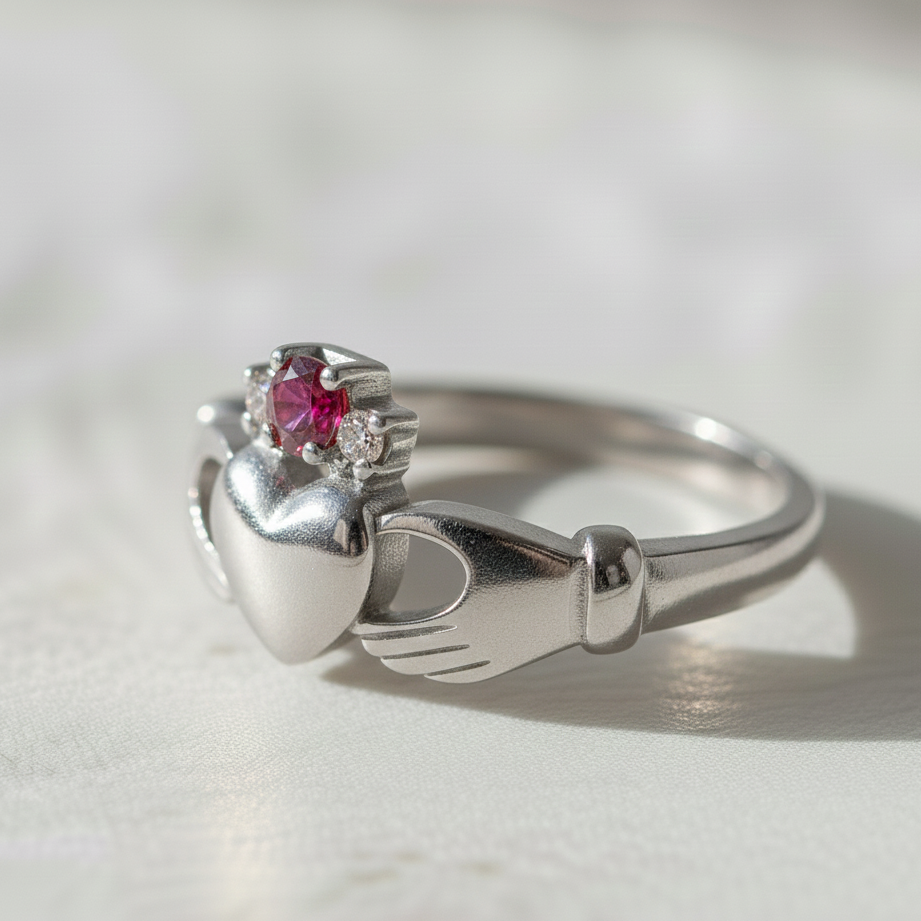 Introducing the Ruby Lover's Kiss Claddagh Ring: Elegance with a Touch of Passion